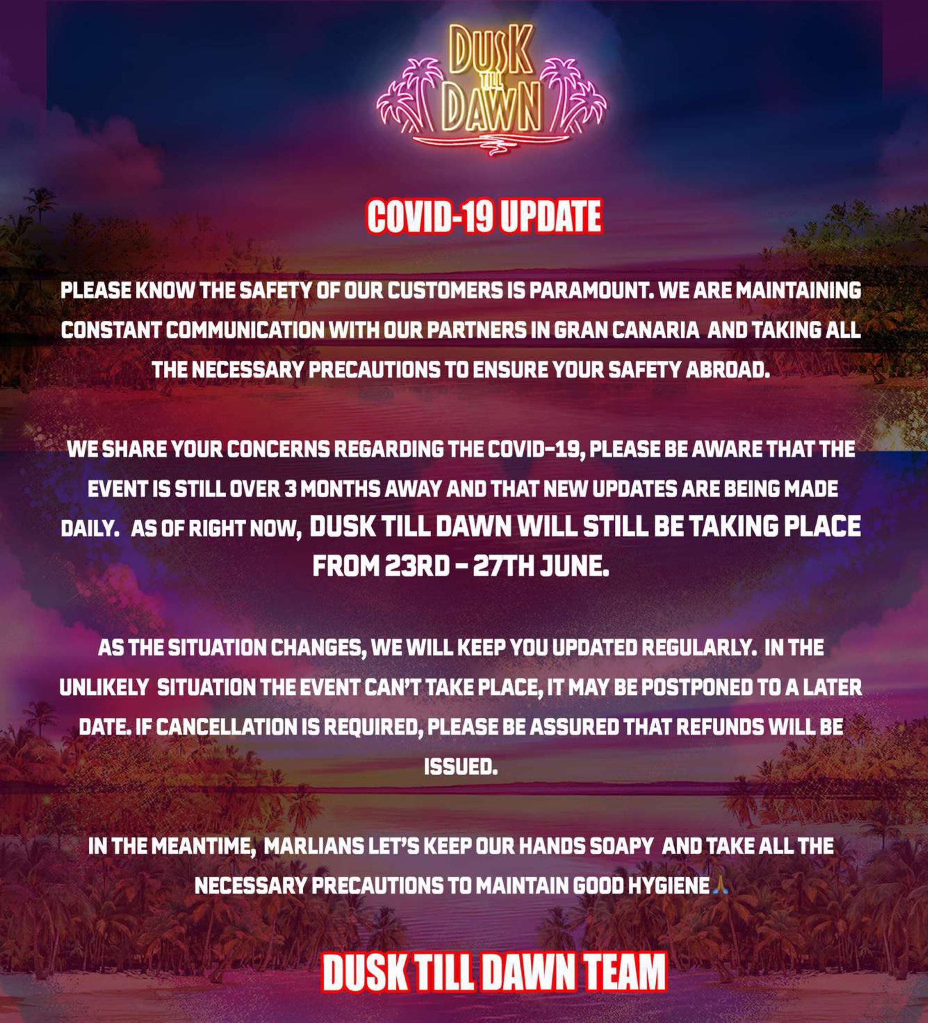 Dusk Till Dawn On Twitter Update Regarding Covid 19 Please Stay Safe Https T Co Ast7wdnlpr Twitter